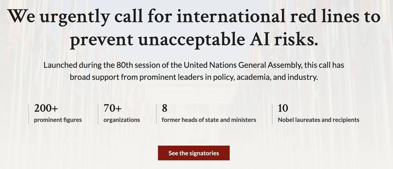 في حدث غير مسبوق، جمعت اجتماعات الجمعية العامة للأمم المتحدة أكثر من 200 شخصية بارزة في العلم والتقنية للمطالبة بوضع خطوط حمراء ملزمة دولياً لتنظيم الذكاء الاصطناعي قبل نهاية عام 2026. هذا التحالف يضم عشرة من الحاصلين على جائزة نوبل ورواد تطوير الذكاء الاصطناعي مثل جيفري هينتون ويوشوا بنجيو وفويتشيك زاريمبا، إضافة لمدراء وخبراء من شركات رائدة. أكدت وثيقتهم المشتركة أن الذكاء الاصطناعي رغم إمكانياته الهائلة يهدد المجتمعات بمخاطر غير مسبوقة، منها البطالة الواسعة، وانتشار المعلومات المضللة، والأوبئة الاصطناعية، وانتهاكات حقوق الإنسان.
