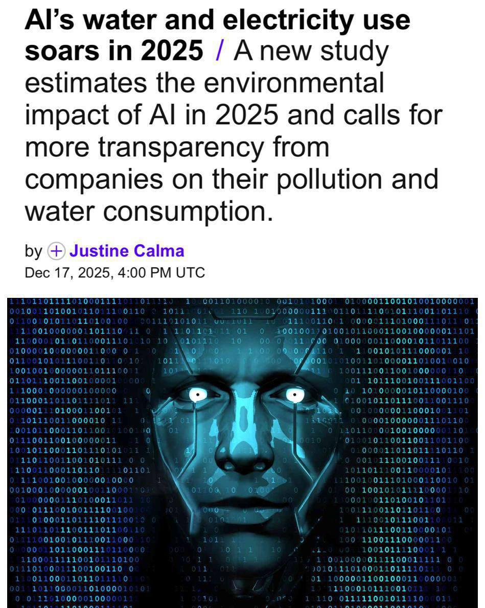 أظهرت دراسة حديثة أن أنظمة الذكاء الاصطناعي باتت في عام 2025 تستهلك كميات هائلة من الطاقة والمياه، مما خلق أثراً بيئياً يوازي استهلاك مدينة كبرى مثل نيويورك. ووفقاً لتقديرات الباحثين، فقد تسبب تشغيل الخوادم والبنى التحتية الخاصة بالذكاء الاصطناعي في انبعاث ما يصل إلى 80 مليون طن من ثاني أكسيد الكربون، وهو رقم يقارب الانبعاثات السنوية لمدينة نيويورك.